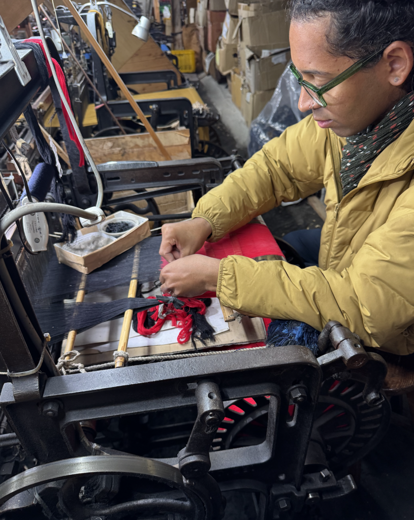 I was drawn to Shimogawa Orimono because of its factory environment and the use of machinery and automated looms in the production of kasuri fabrics. I was curious to see the limitations but also the potential of working in this way.